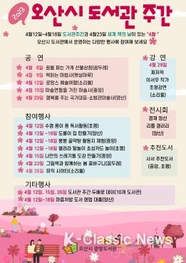 K-Classic News 최지은 기자 | 오산시 중앙도서관은 봄의 따스한 기운이 가득한 4월에 제1회 도서관의 날(12일), 제59회 도서관주간(12~18일), 세계 책의 날(23일)을 맞아 초청강연, 공연, 체험행사, 전시 등 다양한 독서문화 행사를 마련했다고 14일 밝혔다.