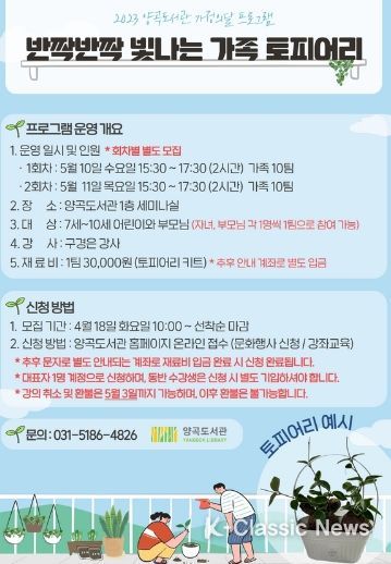 K-Classic News 최지은 기자 | 김포시 양곡도서관은 5월 가정의달을 맞아 5월 10일과 5월 11일 이틀에 걸쳐 부모 동반 어린이 프로그램 ‘반짝반짝 빛나는 가족 토피어리’를 운영한다.