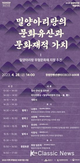 K-Classic News 최지은 기자 | 밀양문화관광재단은 오는 28일 오후 2시 창원컨벤션센터(CECO) 600호에서 밀양아리랑 무형문화재 지정 추진을 위한 학술대회 ‘밀양아리랑의 문화유산과 문화재적 가치’를 개최한다.