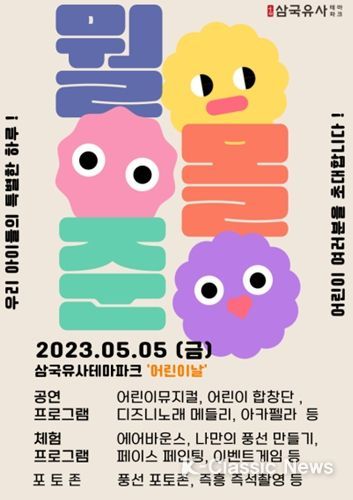 K-Classic News 최지은 기자 | 삼국유사테마파크는 5월 5일, 어린이날을 맞아 '뭘 몰 준(뭘 좋아할지 몰라서 다 준비했어)'을 주제로 어린이들이 좋아하는 것을 다 모아놓은, 어린이를 위한 어린이날 축제를 개최한다고 밝혔다.