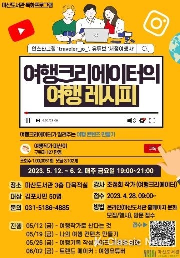 K-Classic News 최지은 기자 | 김포시 마산도서관은 평소 여행작가와 여행 유튜버, 여행 인플루언서 등 여행크리에이터에 관심 있는 시민을 위해 5월 12일부터 6월 2일까지 매주 금요일 마산도서관 특화프로그램 ‘여행크리에이터의 여행 레시피’를 운영한다.