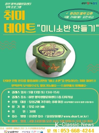 K-Classic News 최지은 기자 | (재)달성문화재단이 운영하는 하빈 행복생활문화센터가 5월 가정의 달을 맞아 온가족이 함께 참여할 수 있는‘취미데이트’ 한지공예 '미니소반 만들기' 원데이클래스 수업 참가자를 모집한다.