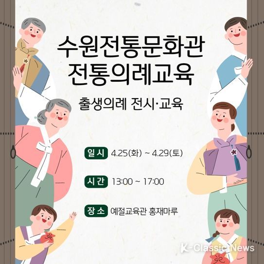 K-Classic News 이호민 기자 | 수원문화재단은 오는 4월 25일 화요일부터 29일 토요일까지 수원전통문화관에서 ‘일생의 시작, 전통의례교육-출생의례’ 전시와 교육을 진행한다.