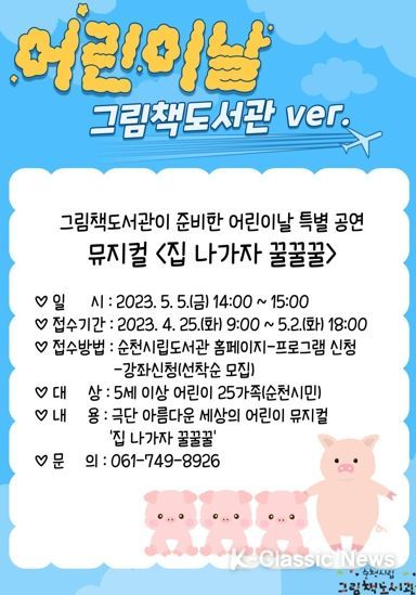 K-Classic News 이호민 기자 | 순천그림책도서관은 어린이날을 맞아 야규 마치코의 명작 그림책 ‘집 나가자 꿀꿀꿀’을 원작으로 한 어린이 뮤지컬을 상연한다.