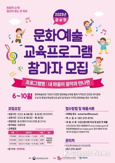 K-Classic News 이호민 기자 | 목포문화예술회관이 국비지원 공모사업에 ‘내 마음이 음악과 만나면’과 ‘포포&포미의 악기 놀이터’ 프로그램이 선정되어 참가자를 모집한다.