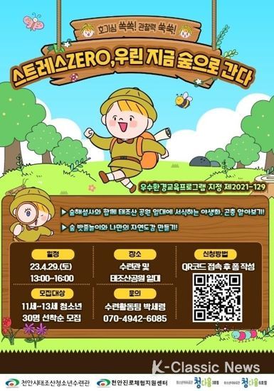 K-Classic News 이호민 기자 | 천안시태조산청소년수련관은 ‘스트레스 제로(zero), 우린 지금 숲으로 간다’ 프로그램을 오는 29일 운영해 11세~13세 청소년 30명을 선착순 모집한다고 밝혔다.