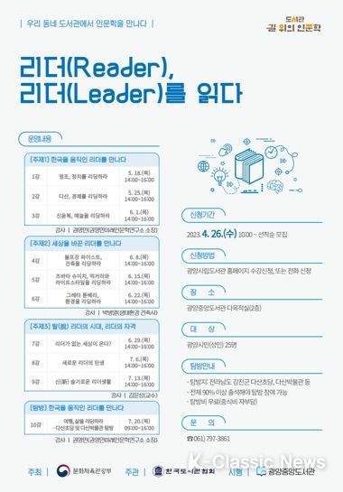 K-Classic News 이호민 기자 | 광양중앙도서관이 오는 26일 오전 10시부터 2023년 도서관'길 위의 인문학'프로그램 참여자를 모집한다고 밝혔다.