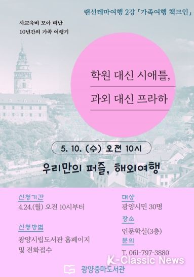 K-Classic News 이호민 기자 | 광양중마도서관은 오는 5월 10일 수요일 오전 10시 도서관 인문학실에서 랜선테마여행 제2차 강연인 ‘가족여행 책크인’'우리만의 퍼즐, 해외여행'특강을 운영한다고 밝혔다.