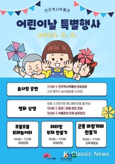 K-Classic News 이호민 기자 | 전주역사박물관이 어린이날을 맞아 어린이 동반 관람객이 특별한 하루를 보낼 수 있도록 다채로운 프로그램을 준비했다.