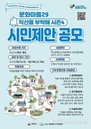 K-Classic News 이호민 기자 | 익산시문화도시지원센터는 익산시민을 대상으로 문화마을 컬처랩‘익산을 부탁해 시즌4-문화마을29 시민제안 공모’를 시작한다고 밝혔다.
