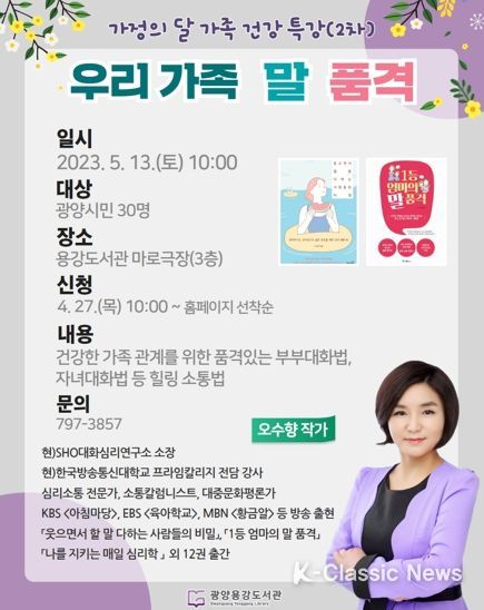 K-Classic News 이호민 기자 | 광양용강도서관은 5월 13일 오전 10시에 심리 소통 전문가를 초청해 2차 가족 건강 특강 ‘우리 가족 말 품격’을 진행한다고 밝혔다.