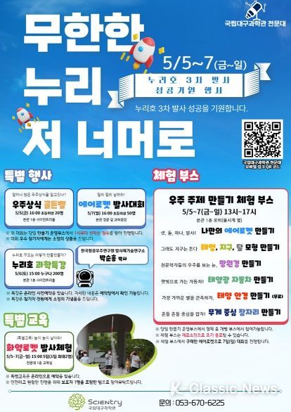 K-Classic News 최지은 기자 | 국립대구과학관은 5월 5일부터 7일까지 누리호 3차 발사의 성공기원 행사 ‘무한한 누리 저 너머로’를 개최한다.