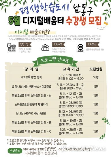 참여를 원하는 남동구민은 디지털배움터 홈페이지에서 온라인으로 접수하면 되며, 전화 접수도 가능하다.