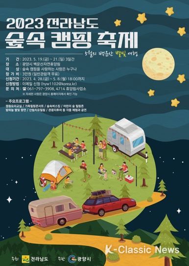 K-Classic News 이호민 기자 | 광양시는 가족 간의 사랑과 추억을 쌓고 숲속의 낭만을 함께 느낄 수 있는 ‘2023 전라남도 숲속 캠핑 축제’ 참가자(팀)를 오는 28일부터 5월 8일까지 모집한다고 밝혔다.