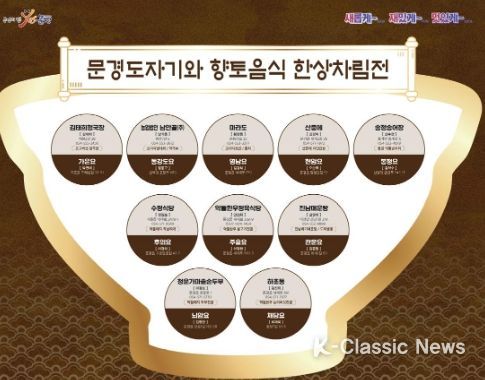 K-Classic News 최지은 기자 | 문경시와 한국외식업중앙회 문경시지부는 찻사발축제 기간 중인 4월 29일 문경새재 오픈세트장 내 백제궁에서 문경도자기협동조합과 협업한'문경도자기와 향토음식 한상차림전'을 기획전시 했다.