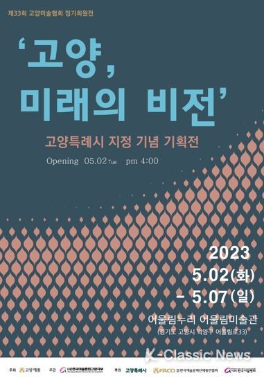 K-Classic News 이호민 기자 | 고양미술협회의 정기 전시가 ‘고양, 미래의 비전’이라는 제목으로 고양어울림누리 어울림미술관에서 5월 2일 개막한다. 전시는 5월 7일까지 열린다.