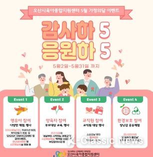 K-Classic News 최지은 기자 | 오산시육아종합지원센터는 5월 가정의 달을 맞아 ‘감사하5! 응원하5!’이벤트를 진행한다고 알렸다.