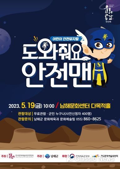 K-Classic News 이호민 기자 | 어린이 안전뮤지컬 '도와줘요 안전맨'이 오는 19일 오전 10시부터 남해문화센터 다목적홀에서 공연된다. '도와줘요 안전맨'은 2023년 ‘문예회관과 함께하는 방방곡곡 문화공감’ 지원 사업의 우수공연프로그램이다.