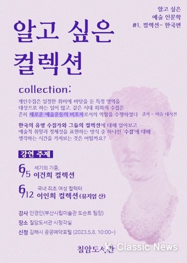 K-Classic News 이호민 기자 | 김해시립 칠암도서관은 내달 5일부터 12일까지 총 2회에 걸쳐 예술특성화 프로그램 ‘알고싶은 컬렉션-한국편’ 강연을 진행한다고 3일 밝혔다.
