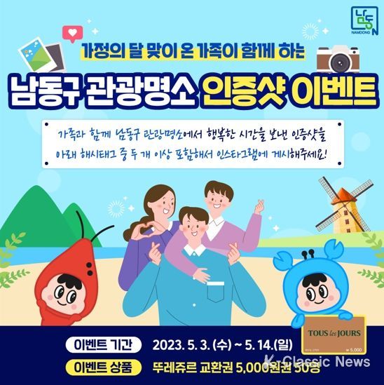 K-Classic News 이호민 기자 | 인천시 남동구는 가정의 달을 맞아 오는 14일까지 소래포구 등 관광명소 SNS 인증샷 이벤트를 진행한다고 3일 밝혔다.