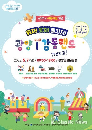 K-Classic News 이호민 기자 | 광양시는 오는 5월 5일 금요일 광양공설운동장에서 개최 예정이었던 제101회 어린이날 기념 ‘광양시 어린이놀이 한마당’ 행사가 기상청의 많은 비와 강풍 예보로 인해 5월 7일 일요일 오전 9시부터 오후 1시까지로 연기 결정했다고 3일 밝혔다.