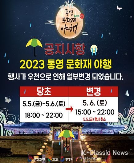 K-Classic News 이호민 기자 | 통영시는 ‘2023 통영 문화재 야행’ 행사를 우천으로 인해 일정을 일부 변경하여 개최한다고 밝혔다.