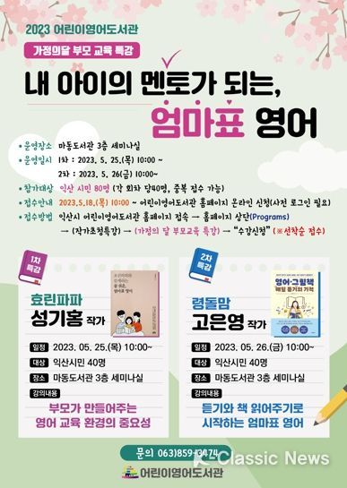 K-Classic News 이호민 기자 | 익산 어린이영어도서관은 5월 가정의 달을 맞아 작가 초청 강연 ‘내 아이의 멘토가 되는, 엄마표 영어’의 수강생을 18일부터 모집한다.