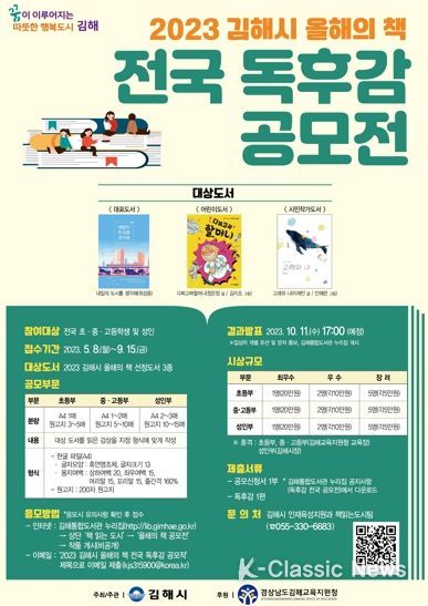 K-Classic News 이호민 기자 | 김해시는 같은 책을 읽고 소통하고 공감하며, 전 국민 책 읽는 문화를 확산하고자 ‘2023 김해시 올해의 책’ 전국 독후감 공모전을 개최한다고 9일 밝혔다.