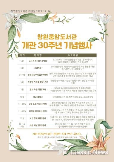 K-Classic News 이호민 기자 | 창원중앙도서관이 개관 30주년을 맞아 연중 다양한 행사를 개최한다.