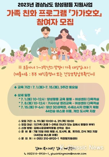 K-Classic News 기자 | (재)김해시복지재단 김해시여성센터에서는 2023년 경상남도 양상평등 지원사업의 일환으로 맞벌이 가정을 대상으로 가족 친화 프로그램 『가가호호』를 운영한다.