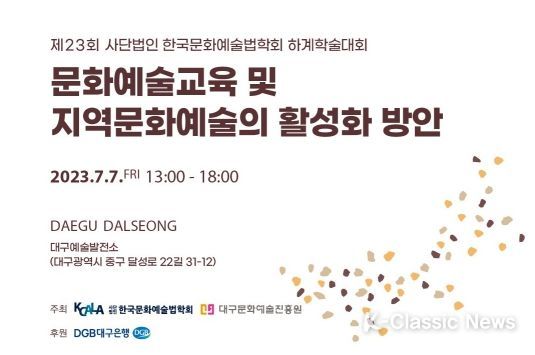 K-Classic News 기자 | (재)대구문화예술진흥원 대구문화예술교육지원센터는 (사)한국문화예술법학회와 공동으로 7월 7일 13시, 대구예술발전소 수창홀에서 ‘한국문화예술법학회 하계학술대회’를 개최한다.