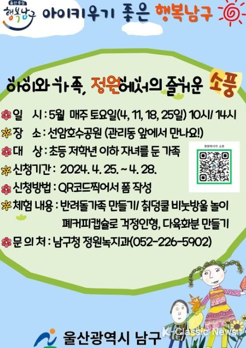 K-Classic News 기자 | 울산 남구는 5월 가정의 달을 맞아 선암호수공원 일원에서 ‘아이와 가족, 정원에서의 즐거운 소풍’프로그램을 운영한다고 26일 밝혔다.