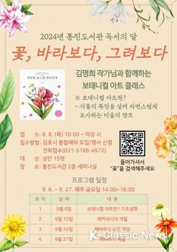K-Classic News 기자 | 김포시 통진도서관이 독서의 달을 맞아 오는 9월 6일 9월 27일까지 매주 금요일 14시부터 통진도서관 2층 세미나실에서 ‘꽃, 바라보다, 그려보다’ 프로그램을 운영한다.