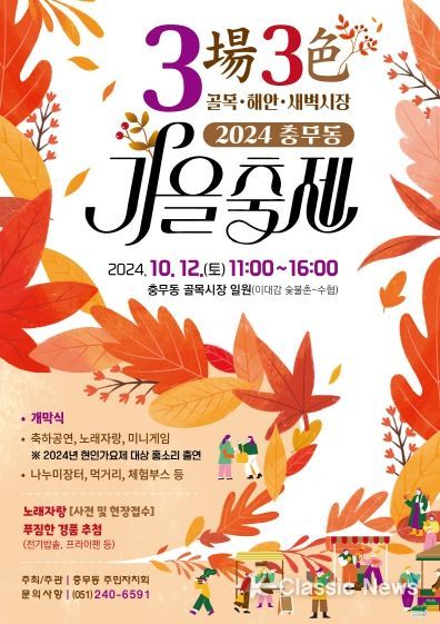 K-Classic News 기자 | 부산 서구 충무동 주민자치회는 오는 12일 충무동 골목시장(이대감 숯불촌~수협) 일원에서 '2024년 3場 3色 충무동 가을 축제'를 개최한다.