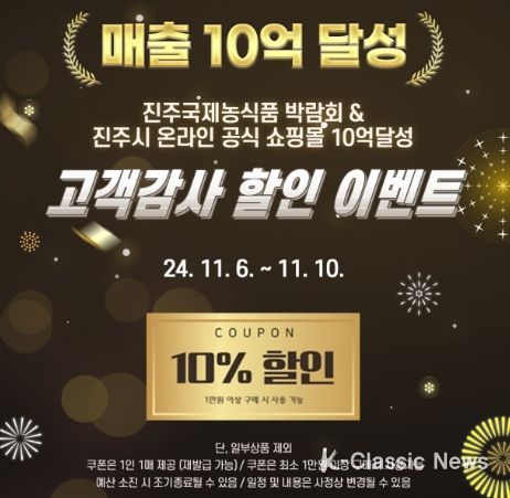 K-Classic News 기자 | 진주시는 2024년 진주국제농식품 박람회 개최와 함께 농특산물 쇼핑몰 10억 원 매출 달성을 기념해 특별 할인 이벤트를 개최하고 풍성한 혜택을 준비했다.