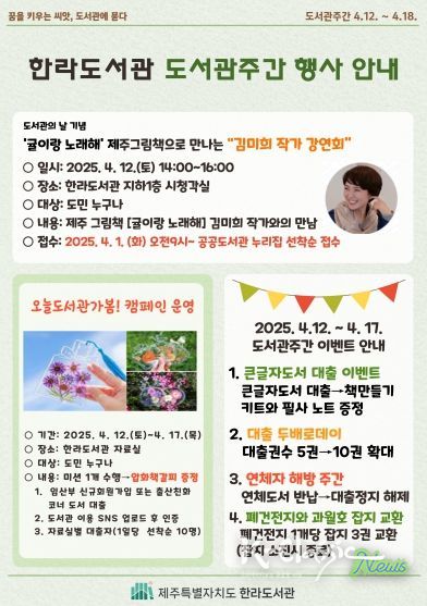 K-Classic News 기자 | 제주특별자치도 한라도서관은 4월 12일 제3회 도서관의 날과 4월 12~18일 제61회 도서관주간을 맞아 ‘꿈을 키우는 씨앗, 도서관에 묻다’를 주제로 다양한 독서 문화행사를 개최한다.