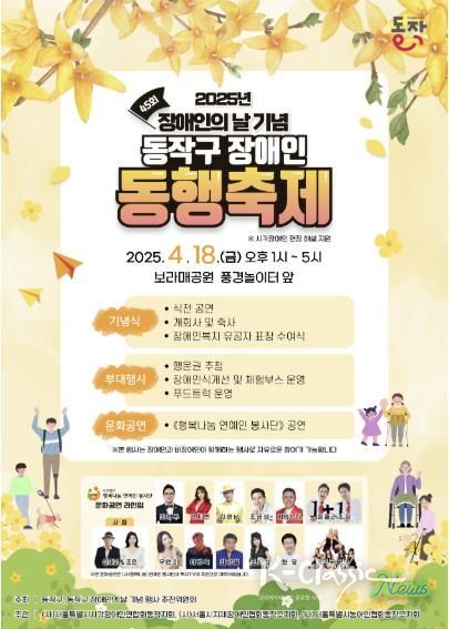 K-Classic News 기자 | 동작구가 제45회 장애인의 날(4월 20일)을 맞아 오는 18일 오후 1시 보라매공원 풍경놀이터 앞에서 ‘2025년 동작구 장애인 동행축제’를 개최한다고 밝혔다.