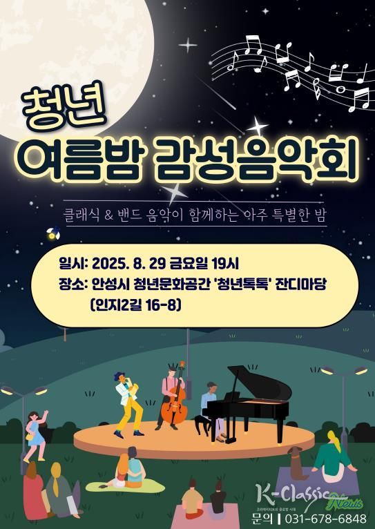 K-Classic News 기자 | 안성시는 야간경제 활성화를 위한 ‘오늘 안성 밤마실 어떠세요?’ 사업의 일환으로, 오는 8월 29일 금요일 오후 7시 안성시 청년문화공간 ‘청년톡톡’ 잔디마당(인지2길 16-8)에서 [SUMMER 스페셜-우리끼리] BING · BAND 청년 여름밤 감성음악회를 개최한다.