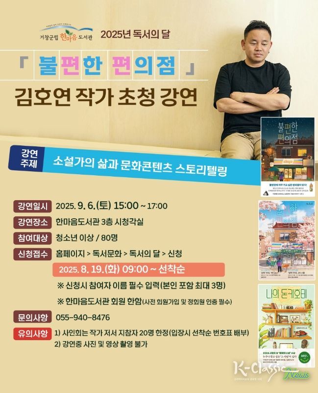 먼저, 9월 6일 오후 3시 ‘불편한 편의점’, ‘나의 돈키호테’의 저자 김호연 작가가 ‘소설가의 삶과 문화콘텐츠 스토리텔링’ 주제로 강연한다. 작가의 창작 에피소드와 스토리텔러로서의 경험을 직접 들을 수 있다.