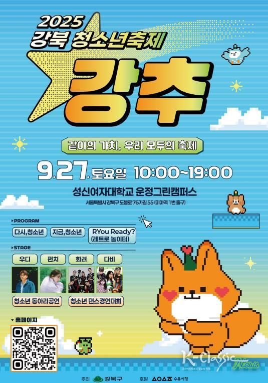 K-Classic News 기자 | 서울 강북구는 오는 9월 27일 오전 10시부터 오후 7시까지 성신여자대학교 미아운정그린 캠퍼스 광장에서 ‘2025 강북 청소년축제 강추’를 개최한다.