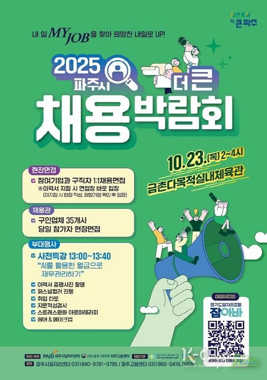 K-Classic News 기자 | 파주시는 오는 10월 23일 금촌다목적실내체육관 2층에서 ‘2025년 파주시 더 큰 채용박람회’를 개최한다고 밝혔다. 이에 앞서 행사에 참여할 구직자를 10월 1일부터 17일까지 모집한다.