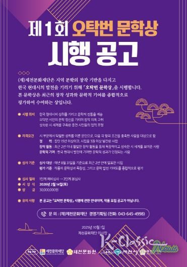 K-Classic News 기자 | (재)제천문화재단(이사장 김상수)은 지역 문학의 창작 기반을 다지고 한국 현대시의 발전을 기리기 위해 제천문화재단 제1회'오탁번 문학상'을 공고했다. 이번 문학상은 최근의 창작 성과와 문학적 기여를 종합적으로 평가하여 수여하는 상으로, 오탁번 시인의 문학 정신을 기리고 문학적 전통을 계승하는데 그 취지가 있다.