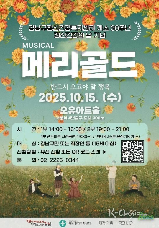 K-Classic News 기자 | 꿈이 모이는 도시, 미래를 그리는 강남구가 정신건강복지센터 개소 30주년과 세계정신건강의 날(10월 10일)을 기념해, 오는 10월 15일 오후 2시와 7시, 오유아트홀(남부순환로378길 34-9)에서 구민과 함께하는 특별 뮤지컬 ‘메리골드 – 반드시 오고야 말 행복’을 개최한다.