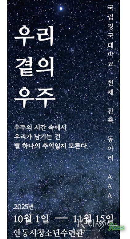 이번 전시회는 청소년수련관과 국립경국대학교 천체 관측 동아리가 함께 준비한 것으로, ‘우리 곁의 우주’를 주제로 청소년들이 직접 촬영한 천체 사진 작품 10점이 선보인다. 특히 청소년들이 동아리 활동을 통해 얻은 성과를 시민과 나누는 자리라는 점에서 의미가 크며, 지역사회가 청소년들의 창의성을 가까이에서 확인할 수 있는 기회가 될 것으로 기대된다.
