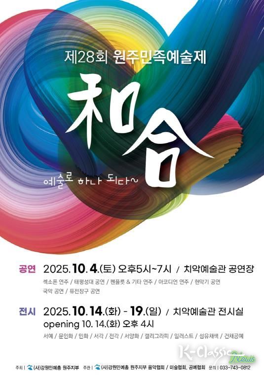 K-Classic News 기자 | (사)강원민예총 원주지부가 주최하는 ‘제28회 원주민족예술제’가 가을의 문을 열며 시민들에게 풍성한 문화적 감동을 선사한다. 치악예술관에서 열리는 이번 축제는 10월 4일 공연과 10월 14일부터 19일까지 진행되는 전시로 구성됐다.