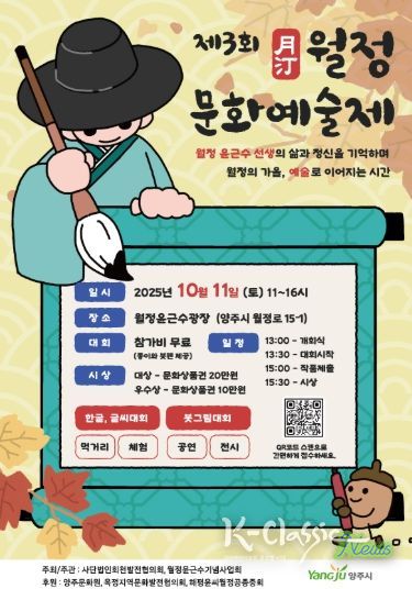 K-Classic News 기자 | (사)회천발전협의회와 월정윤근수기념사업회가 공동 주최하는 ‘제3회 양주 월정문화예술제’가 오는 10월 11일 오전 11시 월정 윤근수 광장(양주시 월정로 15-1)에서 열린다.
