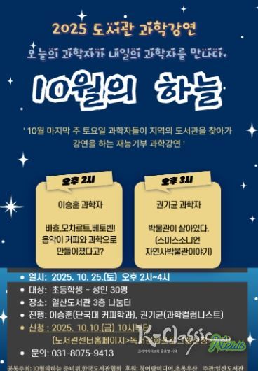 K-Classic News 기자 | 고양특례시 일산도서관에서는 과학자들의 재능기부 도서관 과학 강연프로그램 ‘10월의 하늘’을 운영한다.