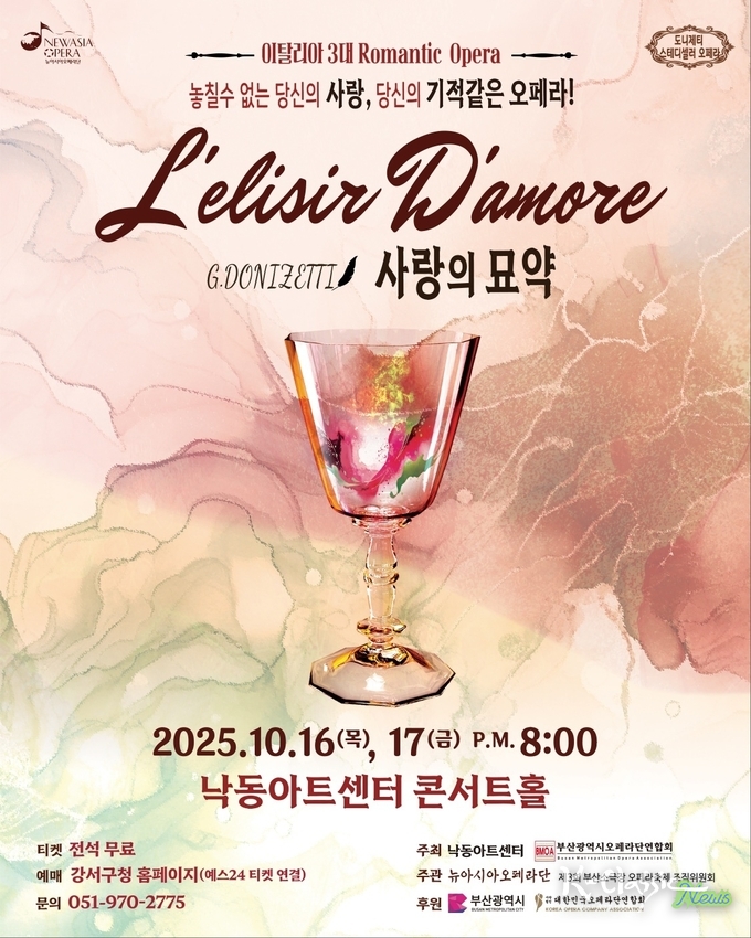 예술총감독을 맡은 그레이스 조 뉴아시아오페라단 단장은 "도니제티의 오페라 '사랑의 묘약'은 인간의 순수한 마음과 사랑의 진심을 노래하는 작품으로, 오늘날에도 여전히 큰 울림을 준다"며 "이번 공연을 통해 관객들이 웃음과 감동 속에서 '사랑의 본질'을 다시 한 번 느끼길 바란다"고 전했다.