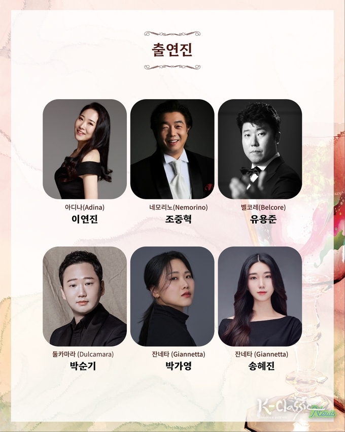 순박하지만 진실한 사랑을 품은 네모리노 역은 부드러운 음색과 감성적 해석으로 호평받는 테너 조중혁이 맡았으며, 당당한 아디나 역에는 폭넓은 표현력의 소프라노 이연진이 출연한다.
