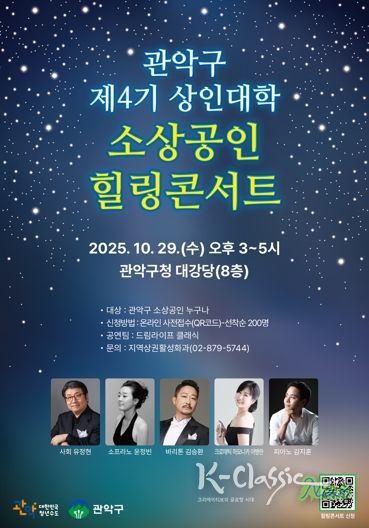 K-Classic News 기자 | 관악구는 오는 10월 29일 오후 3시, 구청 8층 대강당에서 관내 소상공인을 위한 힐링콘서트를 개최한다.